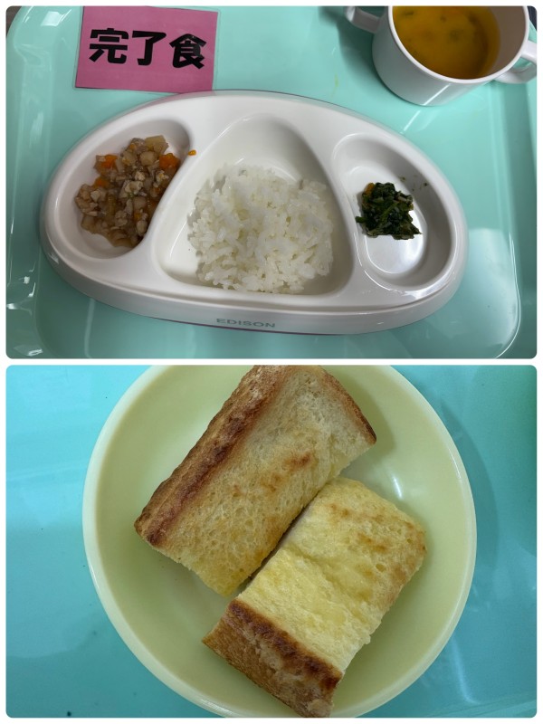 ご飯、筑前煮、ほうれん草とえのきのお浸し、みそ汁 15時のおやつ フレンチトースト