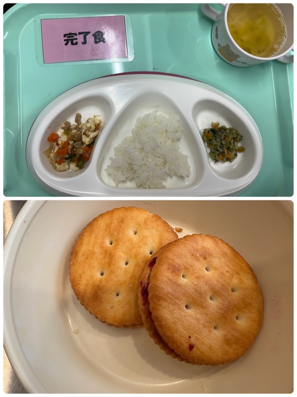 ご飯,厚揚げと豚肉のみそ炒め、小松菜のツナ和え、すまし汁 15時のおやつ クラッカーサンド
