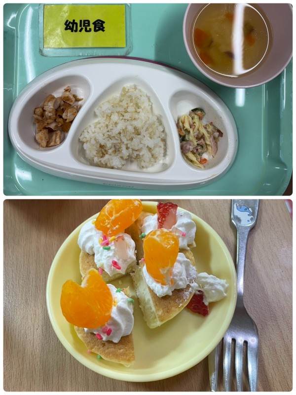 ご飯、ローストチキン、マカロニサラダ、コンソメスープ 15時のおやつ クリスマスホットケーキ