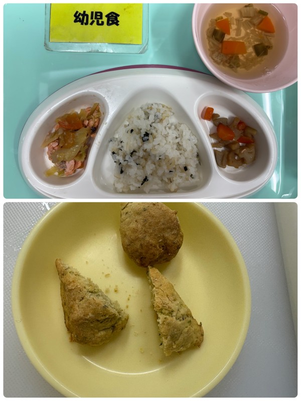 わかめご飯、鮭のちゃんちゃん焼き、きんぴられんこん、すまし汁 15時のおやつ 小松菜バナナスコーン