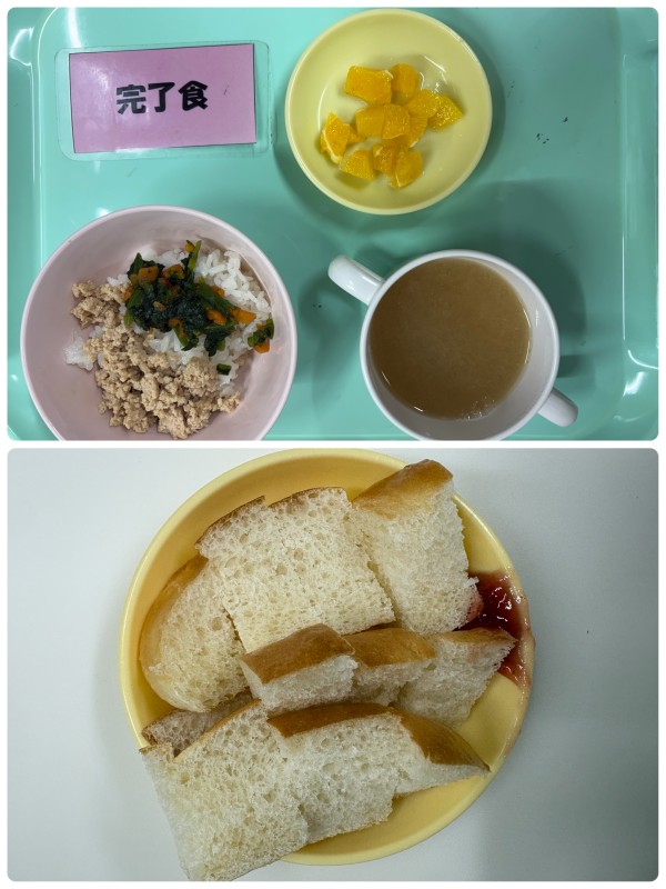 三色丼、みそ汁、オレンジ 15時のおやつ ロールパン
