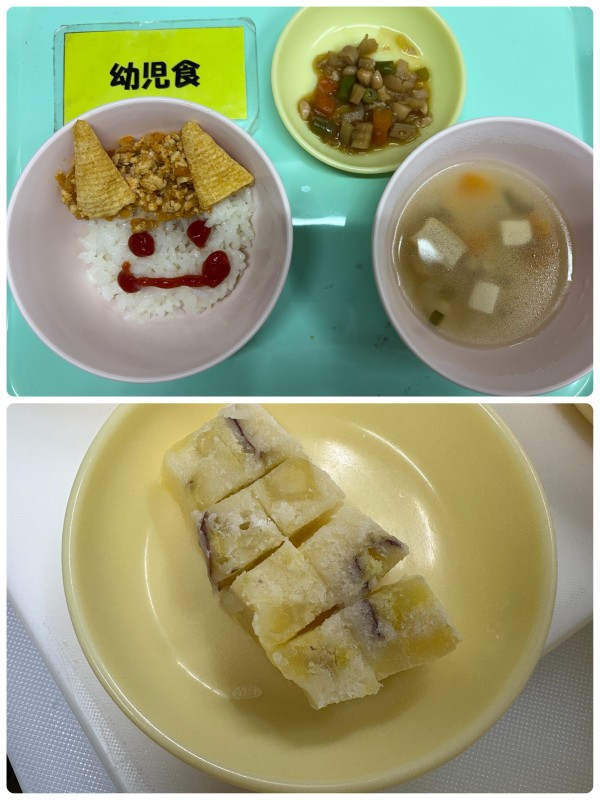 おにご飯、五目煮豆、けんちん汁 15時のおやつ 鬼蒸しパン