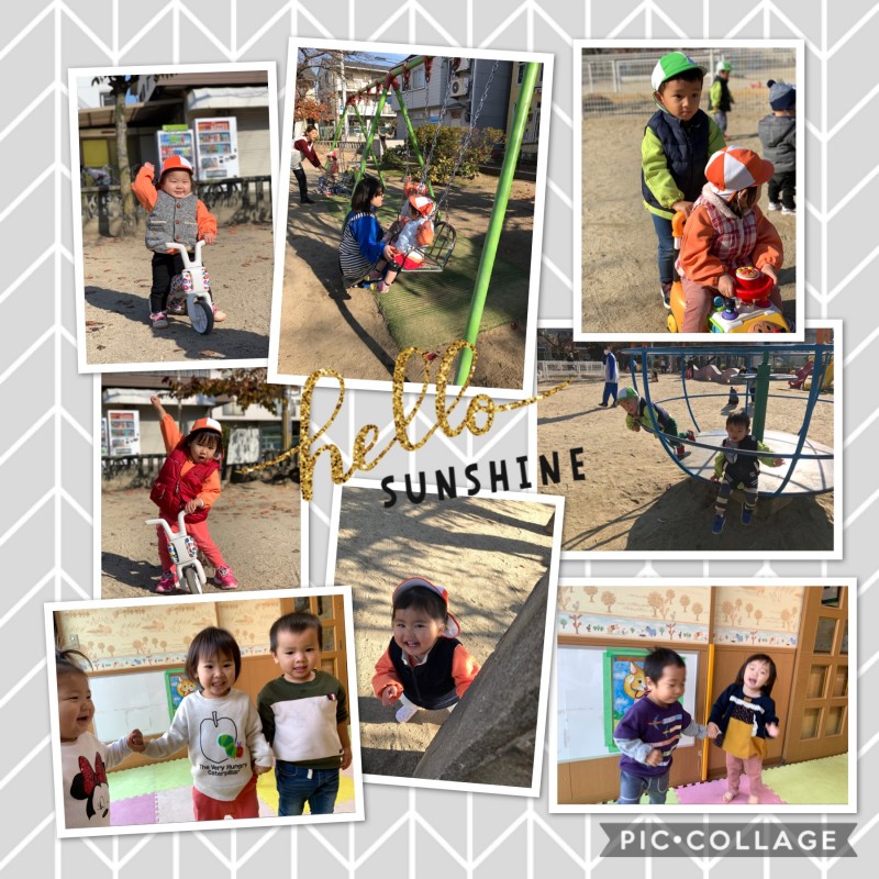 朝は冷え込んでいますが、お外で遊ぶ頃にはポカポカと暖かく、うさぎ組のみんなも元気に走りまわっています。コンビカーや三輪車に乗ったり、丸いジャングルジム、ブランコなど大好きな遊びを見つけて、笑顔が溢れていました。