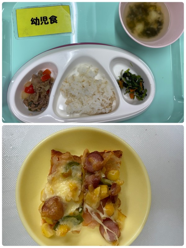 ご飯、豚肉とキャベツの味噌炒め、ほうれん草のしらす和え、中華スープ 15時のおやつ ピザトースト🍕