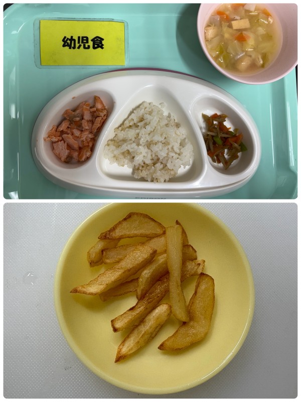 ご飯、鮭の塩焼き、きんぴらごぼう、みそ汁 15時のおやつ フライドポテト