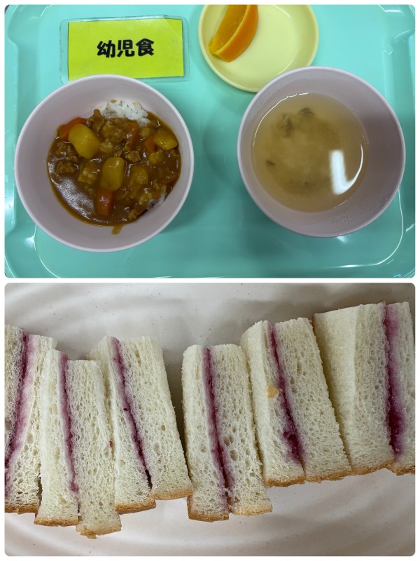 カレーライス、きのこのスープ、オレンジ 15時のおやつ ジャムサンド