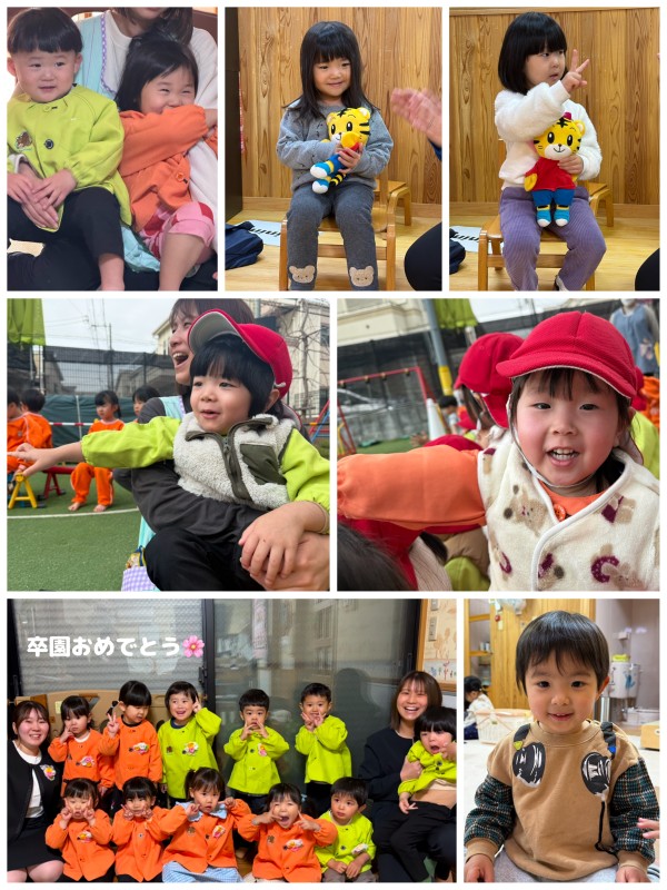 りす組さんが今日で卒園となりました🌸卒園式の後も皆仲良く、朝の会ではいないいないばあ!と変顔対決をしたりお外遊びではかくれんぼや鬼ごっこ、たくさん皆で仲良く遊んだね😌💭優しい優しいりす組さん達に、たくさんの笑顔と勇気をもらった1年間でした。皆それぞれ違う場所に進むけれど、新たな場所で心から笑える日々を願っています。りす組さん、ありがとう☺️✨またいつでもくるみ保育園に遊びに来てね☁໒꒱·゚