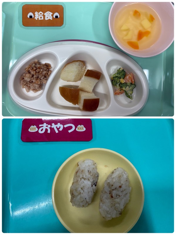パン、タンドリーチキン、ブロッコリーマヨサラダ、スープ 15時のおやつ おにぎり(じゃこおかか)
