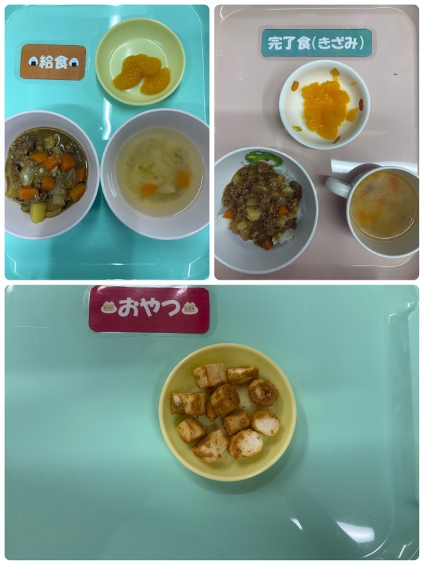 カレーライス、スープ、みかん缶 15時のおやつ きな粉麩のラスク