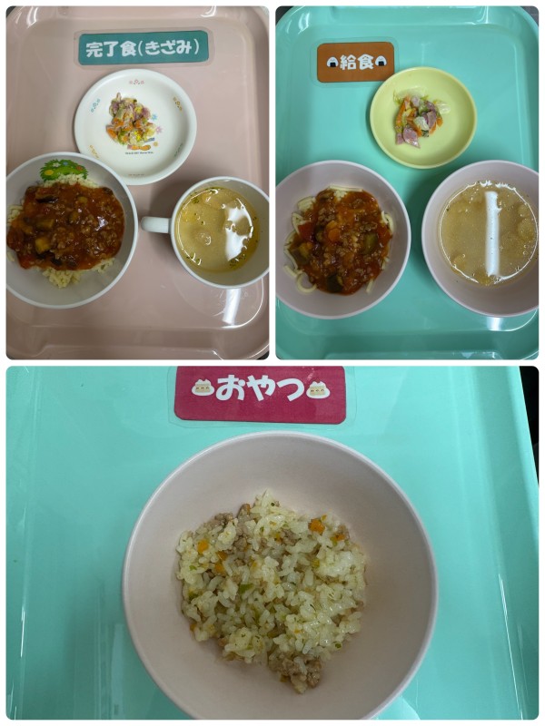 なすのミートスパゲッティ、白菜のサラダ、オニオンスープ 15時のおやつ おやつチャーハン