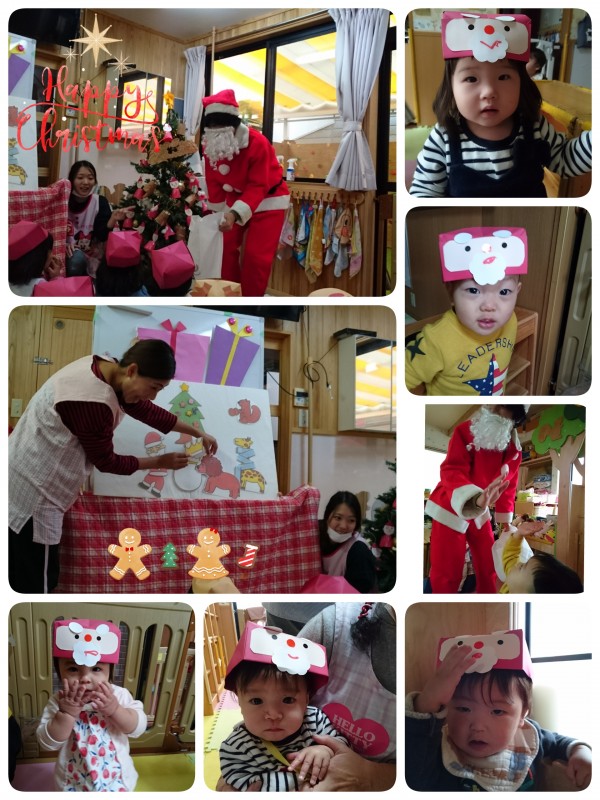 今日は、お誕生日会とクリスマス会✨🎄✨がありました。クリスマスにちなんだ手遊びに手品、パネルシアターを見ました。じっと見る子ども達。最後にサンタクロース🎅の登場にビックリ‼️ 慌てて保育士にしがみつく子がいたり、立ったままジーと様子を見る子がいました。サンタさんと写真撮影では怖々近づき、帰りにはタッチができました。