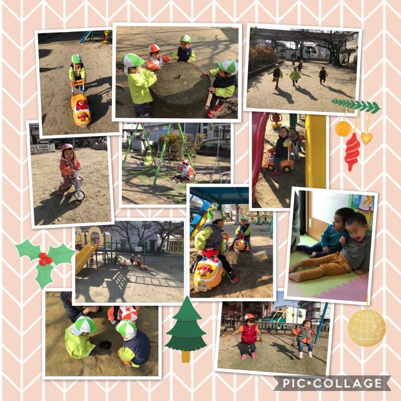 早くお外で遊びたくて「お外いくー?」と朝から聞いてくる子どもたちです。「行くよ」の返事に、「やったーー!!」と大喜びです。寒くても子どもたちはへっちゃらですね♪コンビカーを押しながらお友だちと一緒にドライブです!