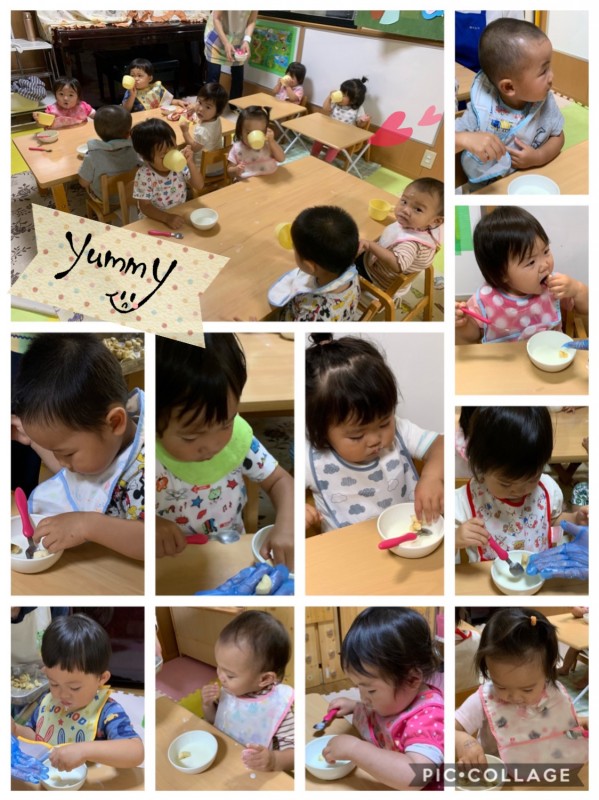 歯科検診の後はクッキングをしました。今月はバナナヨーグルト!自分でヨーグルトにバナナをトッピングしました。みんなバナナが大好きなのでヨーグルトに入れる前にまずは一口パクっ!そのあとはトッピングを頑張ってくれました。とっても美味しいバナナヨーグルトができました。
