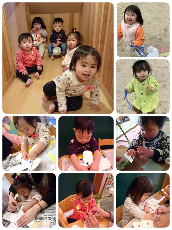 今日は、製作で なぐり描きとシール貼りをしました。特にシール貼りには みんな集中して一生懸命貼っていました。器用に指先を使い、「ペタペタ」言いながら楽しく貼っていました。出来上がりは、明日のお楽しみです!その後、公園でしっぽ取りや凧上げをして遊びました。