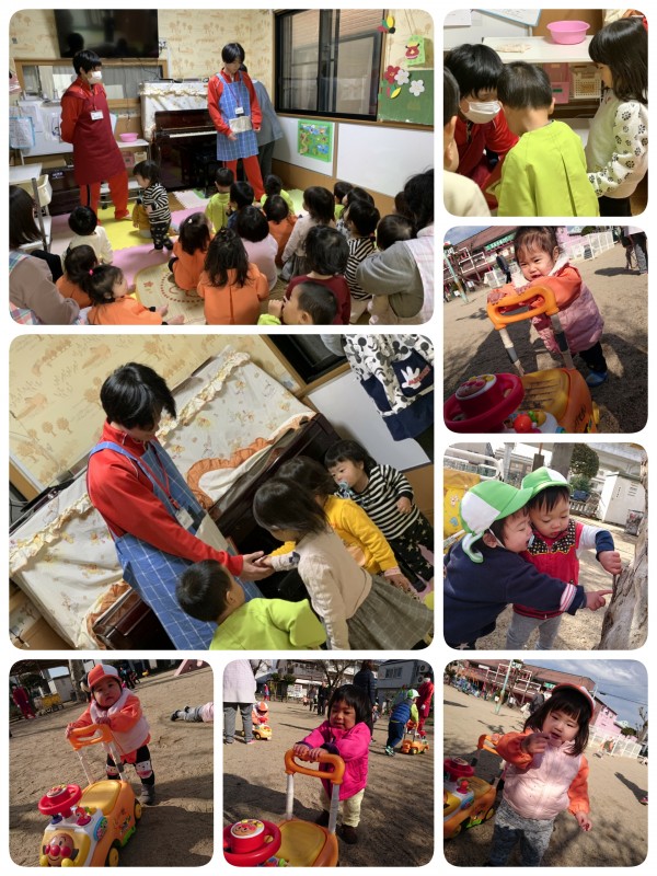 今日も、元気に公園で遊びました。ひよこ組の子ども達 全員が歩けるようになり、アンパンマン号を押して楽しんでいます。また、この一年間実習に来ていた学生二人が、今日で最後となりました。みんなで歌を歌い、お礼のカードを渡しました。「お兄ちゃん先生ありがとう❗」「お姉ちゃん先生また来てね❗」と、最後はタッチしたり、抱っこしてもらいに駆け寄っていき、別れを惜しんでいました。