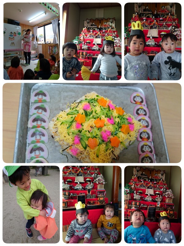 今日はひなまつりです。先週からひなまつりの製作をしたり、お雛様の前で写真を撮ってきました。そして今日、ひなまつりの集いでは、みんなで歌ったり手品やペープサートを見て楽しみました。給食はちらし寿司です。きれいに飾り付けされていて美味しくいただきました。