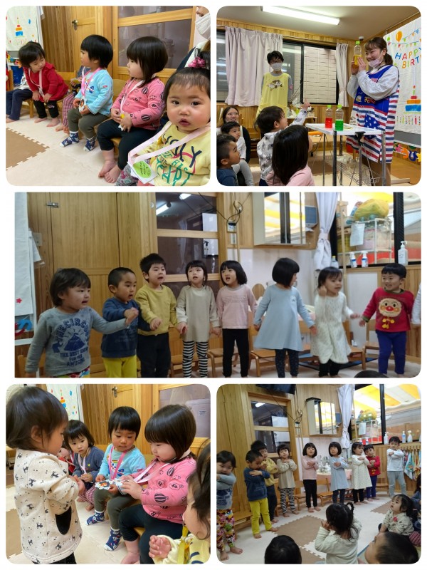 今日は3月生まれのお誕生日会とお別れ会がありました。お別れ会では、最初にりす組さんの歌「ぼくらは未来の探検隊」、「思い出のアルバム」を歌ってくれました。ひよこ組さんには、いつも優しく遊んでくれたりす組さん達です。歌を聞いていると、こちらの方が胸が熱くなる思いです。そして、ひよこ組からも4人のお友達とお別れです。寂しいけど、新しい所でも元気で頑張ってね! の気持ちを込めて…「たくさんの笑顔をありがとうー‼️」