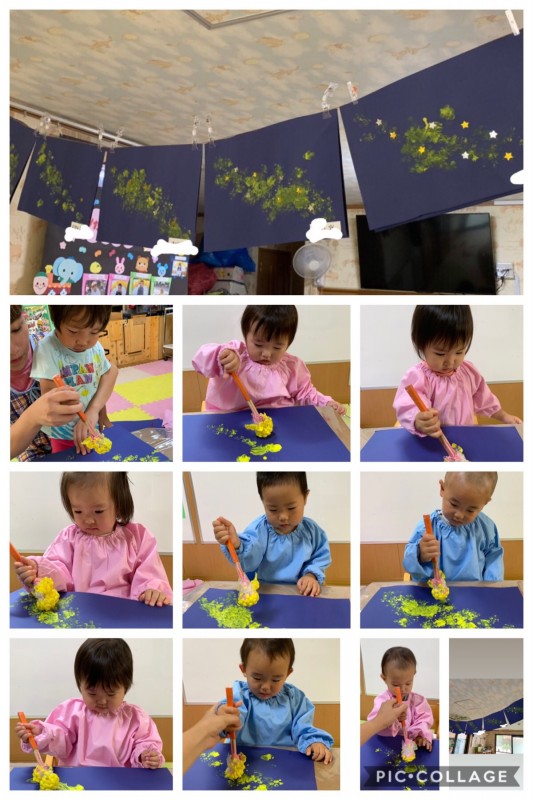 雨が降っていたのもあり、お部屋で天の川の制作をしました。たんぽうしというものに黄色の絵の具をつけ、紺色の画用紙にとんとんと、星空をつくっていきました。真剣な表情で、一生懸命やってくれる子どもたちです。七夕のイメージが膨らみ、金曜日の七夕のイベントがとても楽しみになりました。