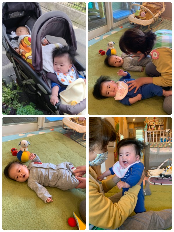 "きゅうりができた♪"を歌い、ふれあいあそびを楽しみました。からだに優しくタッチすると、ニッコリ笑顔があふれました。