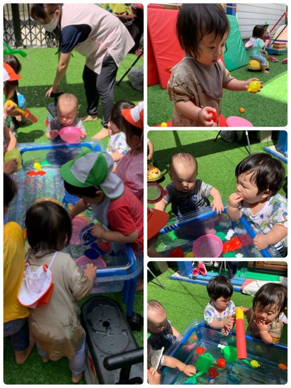 今日は水遊びをしました!大きいお友達の輪の中に入り「キャー!」と大はしゃぎです!水を怖がることなく頭からずぶ濡れでになりながら楽しみました!