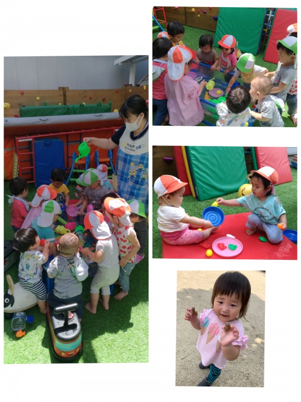 ぞうさんのシャワー、気持ちよかったね。お外遊びのお友達は、公園でセミのぬけがらを見つけたよ!