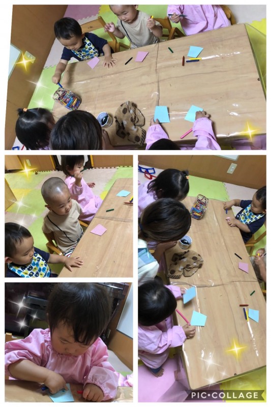 雨の日が続き、お外に行けなくて少し残念です。しかし、お部屋では今日もとっても楽しい七夕制作をしました♪織姫様と彦星様のお洋服にグーピーとゆうペンで模様をつけます。みんなとっても可愛く描いてくれていました。そして、星のシールをぺたぺたと貼り、完成です♪他にも、指先に黒い絵の具をつけ、スイカの種をとんとんつけました。真剣な表情で集中してやったり、ニコニコ楽しんだり、微笑ましかったです♪