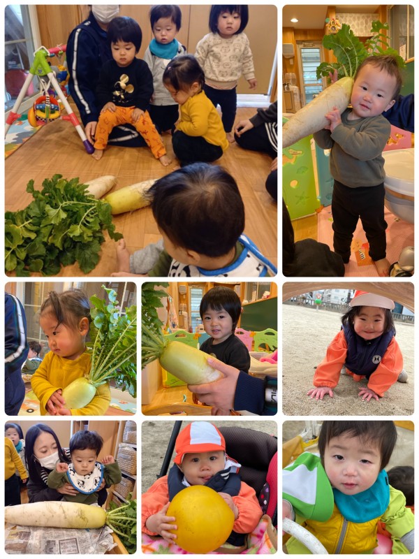 朝に大きな大根を見ました🥬大きな葉っぱに驚き少し怖がるひよこ組さんそーーっと触ってみると、こんこんと言ったり抱っこして重たそうな顔をしたりととても楽しそうでした😊公園では冷たい風が吹くなか、元気いっぱいに走り回っていましたよ!!