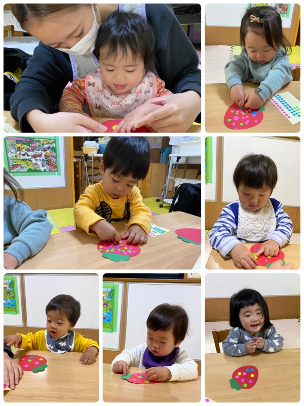 5月の製作でイチゴを作ってみました🍓❤︎シールを一生懸命貼るうさぎ組さん!!ペッタンペッタン楽しかったね!とっても可愛らしいイチゴができました☺️