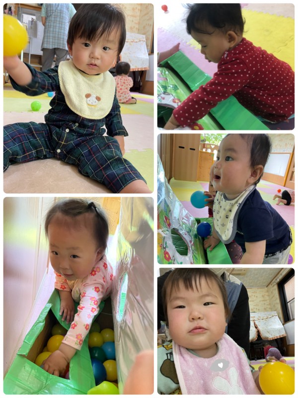 今日はお部屋でボール遊びをしました❕いつもとは違う広いお部屋でボールと追いかけっこ🏐🍃一人歩きやハイハイを上手にしながらボールを追いかけていましたよ🚼穴にボールを入れて一生懸命集めている様子もとても楽しそうでした☺️