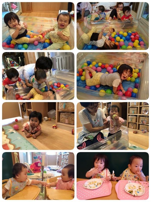 今日は雨☔のため、部屋でボールプールをしました。プールの中へ勢いよくダイブしたり、お腹にボールを入れたりして遊びました。たくさん遊んで、「お腹すいたよ〰️‼️」と子ども達。「早く食べたい」気持ちがすごく、子ども達の食欲にはびっくりさせられます。