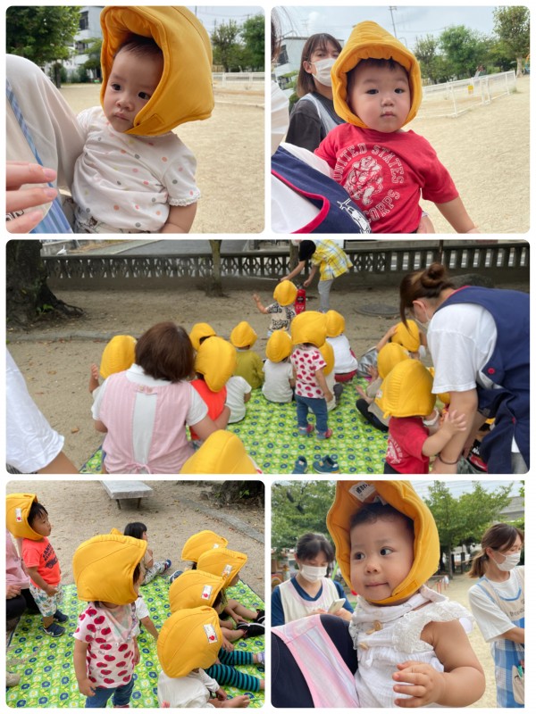 避難訓練(地震)をしました。防災頭巾をかっこよく被って、素早く避難することが出来ました!