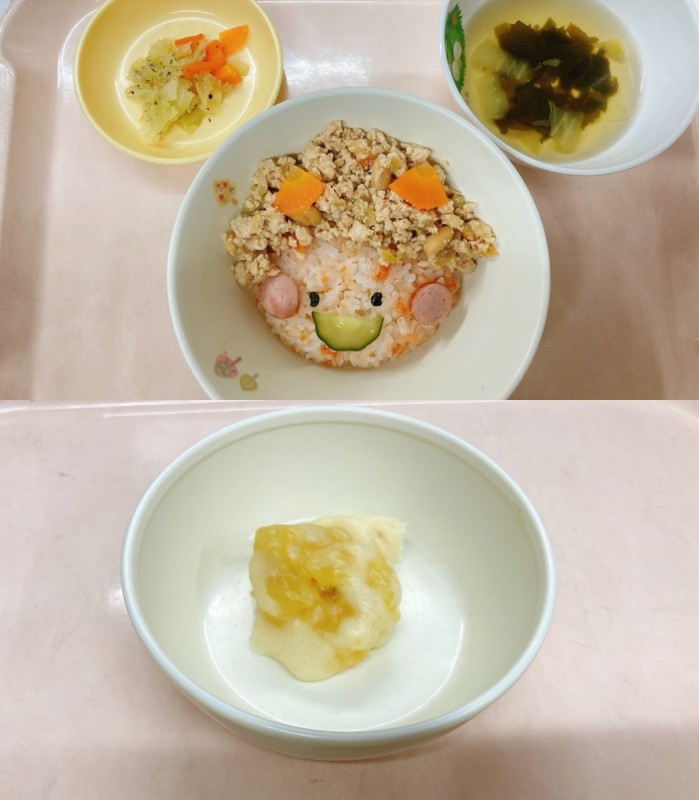 刻み・幼児食節分オニライス キャベツのゆかり和え 白菜のスープ三時のおやつおに蒸しパン