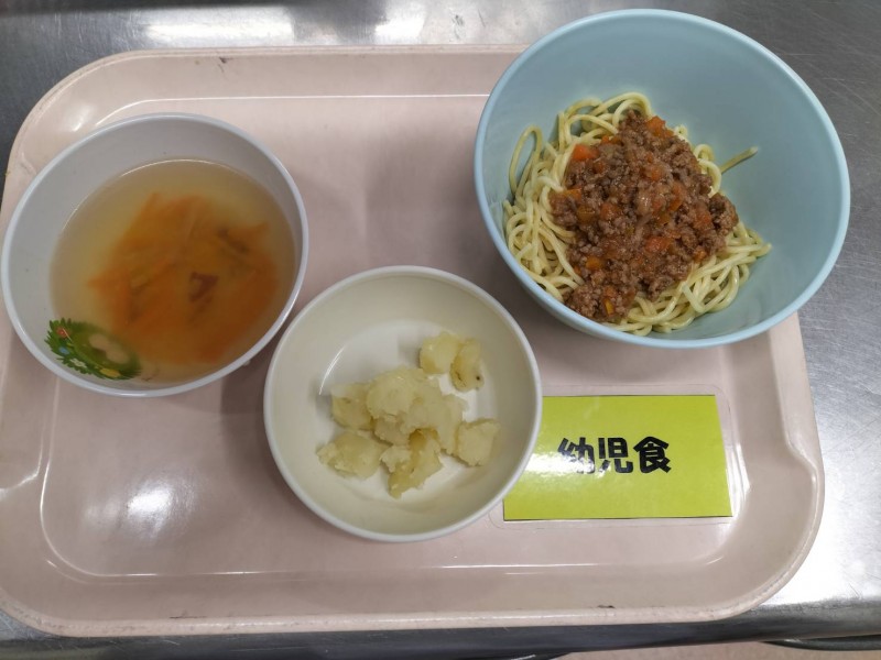 ミートスパゲティ、ベイクドじゃが(あおのり)、スープ(さつまいも・たまねぎ)