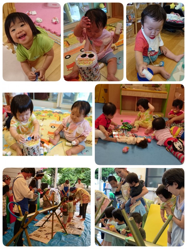 今日は、クッキングで流しそうめんが行われました。りす組やうさぎ組さんがしている様子を、順番に見ました。流れるそうめんを、不思議そうに 見つめる子ども達でした。今回は、見るだけででしたが、給食のそうめんは とても喜んで食べていました。部屋では、ポットン落としに夢中で遊んでいました。