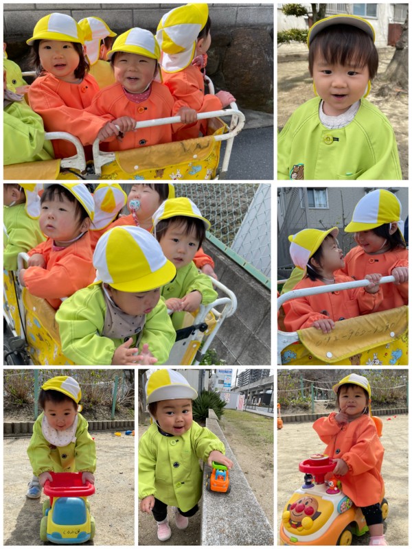 バギーに乗り、くるみの森保育園までお散歩に行ってきました☺️目にする車の色を「あかー!しろー!」とお話しながらお散歩を楽しみました。到着すると「遊ぶ遊ぶ🎶」とノリノリなひよこ組さん🐣お散歩だけの予定でしたが少しお邪魔し、広い園庭でたくさん体を動かし遊びました👀🍀帰りの道もお友達とお話を楽しむ仲良しなひよこ組さんです。