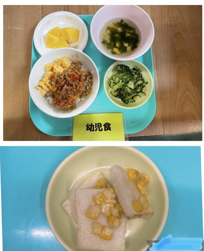 ガパオライス、ブロッコリーのごまサラダ、わかめスープ(コーン)、パイン缶 15時のおやつ トースト(コーンマヨ)