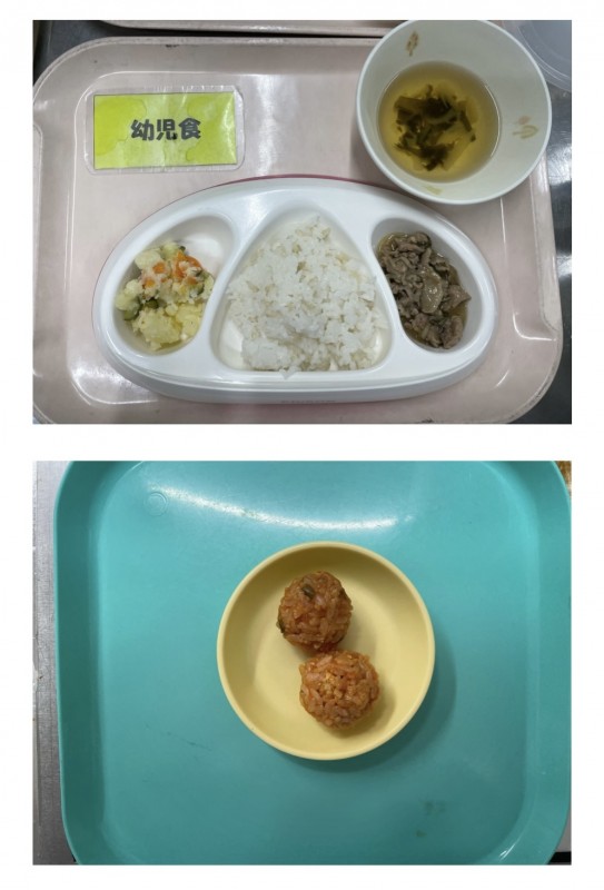 御飯、豚肉や香味焼き(もやし)、ポテトサラダ(りんご)、すまし汁(たまねぎ、わかめ) 15時のおやつ ケチャップライスおにぎり