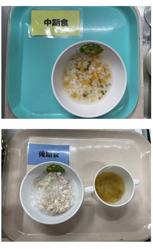 中期 おかゆ(にんじん、たまねぎ、ほうれん草) 後期 鶏ひき肉のおじや、みそ汁 15時のおやつ ハイハイン