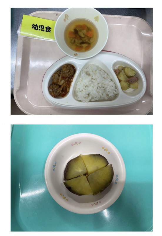 御飯、肉団子と野菜のトマト煮、ジャーマンポテト、きのこのスープ 15時のおやつ 蒸し芋