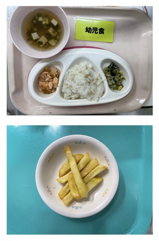 御飯、鮭のコーンフライ、ほうれん草のツナあえ(キャベツ)、豆腐のすまし汁(なす、ねぎ) 15時のおやつ フライドポテト