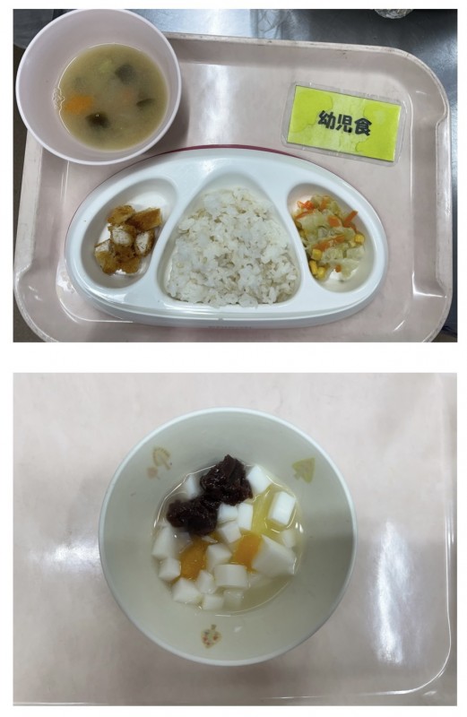 御飯、鷄かつ(卵なし) 、コールスローサラダ、みそ汁 15時のおやつ 牛乳かんのあんみつ