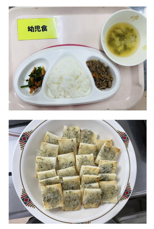御飯、牛肉とごぼうの炒め煮、ほうれん草のごま和え(人参)、みそ汁(じゃがいも、たまねぎ) 15時のおやつ トースト(じゃこ)