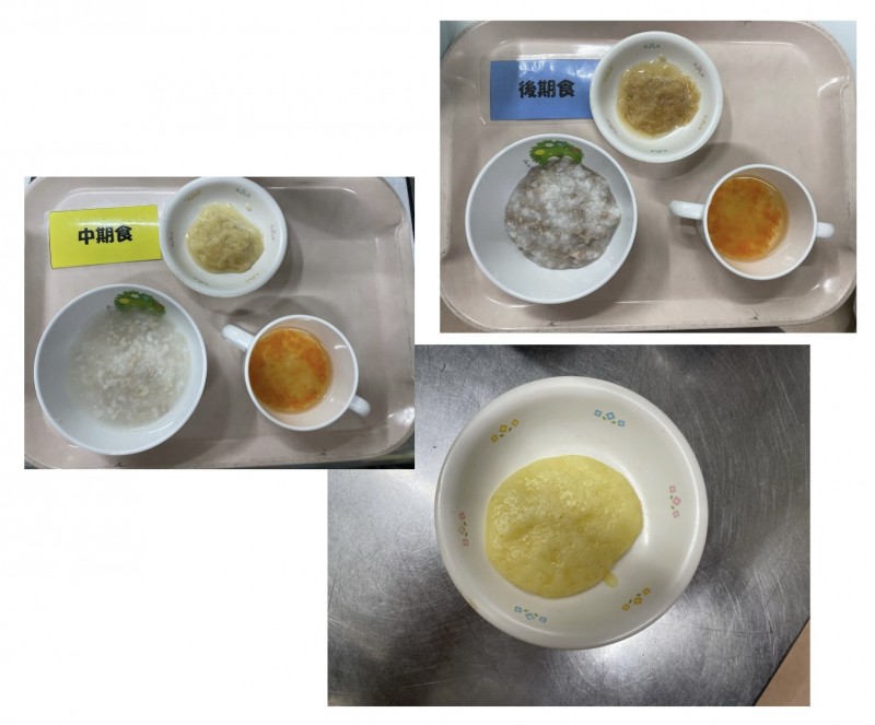 中期 鷄そぼろおじや、スープ、りんご 後期 豚そぼろおじや、スープ、りんご 15時のおじや 蒸しパン