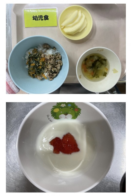 キッズビビンバ、わかめスープ(キャベツ)、りんご 15時のおやつ ヨーグルト(いちごジャム)