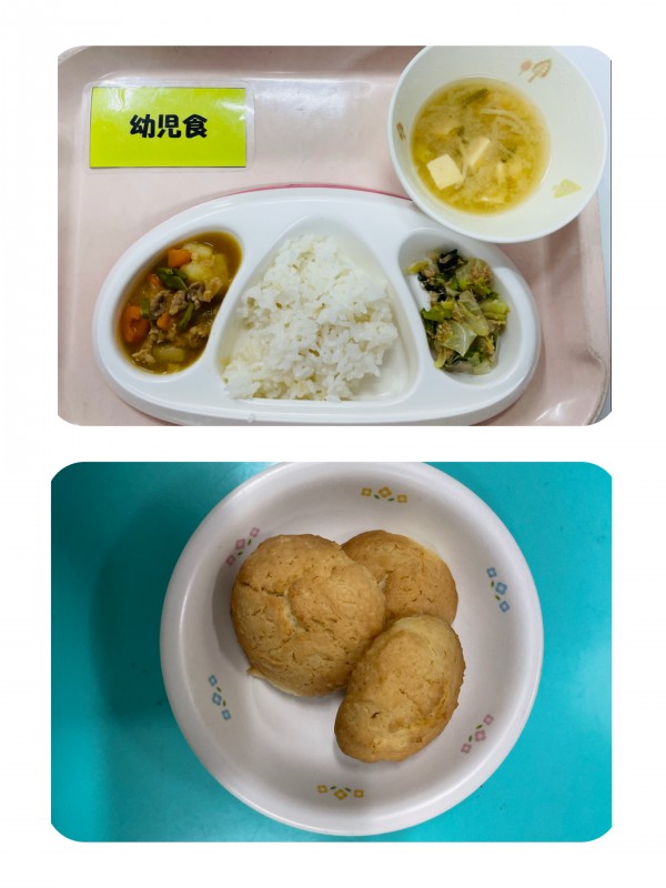 御飯、肉じゃが、小松菜のツナあえ、豆腐みそ汁 15時のおやつ クッキー