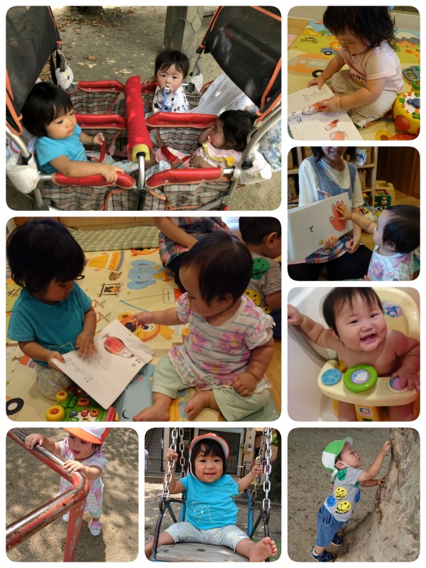 子ども達は「だるまさんが」シリーズの絵本が大好きです。今日は、先生に読んでもらい、その後 お友達と一緒に見ていました。公園では、ブランコやシャボン玉を追いかけて遊びました。暑い日が続きますが、元気で過ごしています。