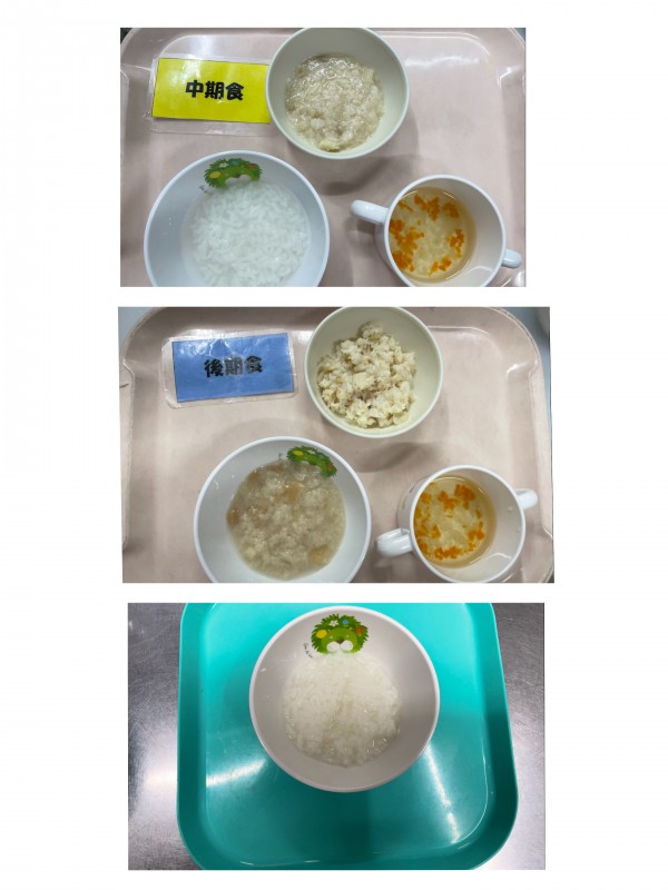 中期 7倍粥、白身魚の煮付け、スープ 後期 パン粥、白身魚の煮付け、スープ 15時のおやつ おかゆ