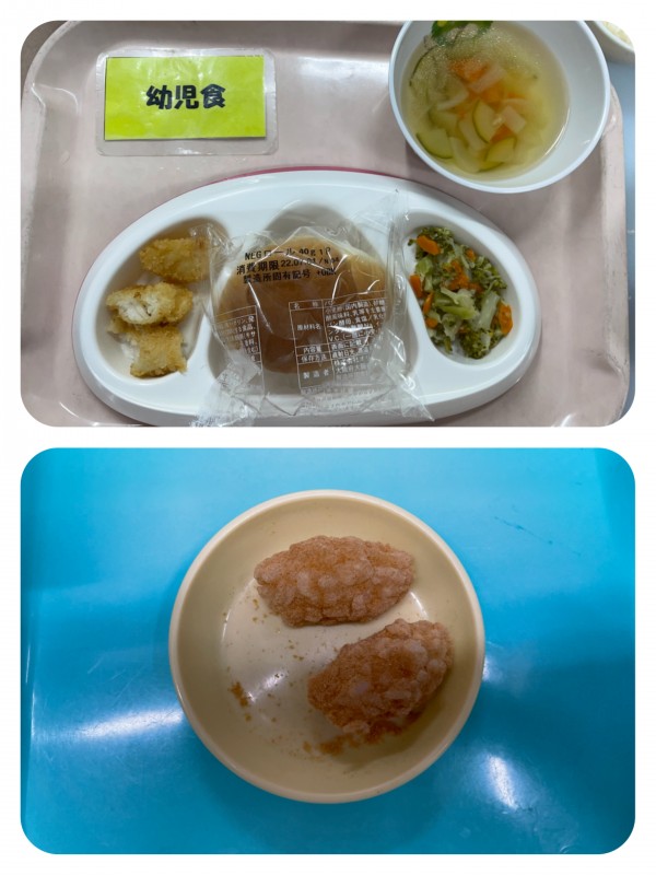 パン、白身魚のフライ、温野菜のサラダ、スープ 15時のおやつ おはぎ(きな粉)