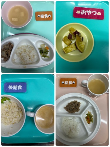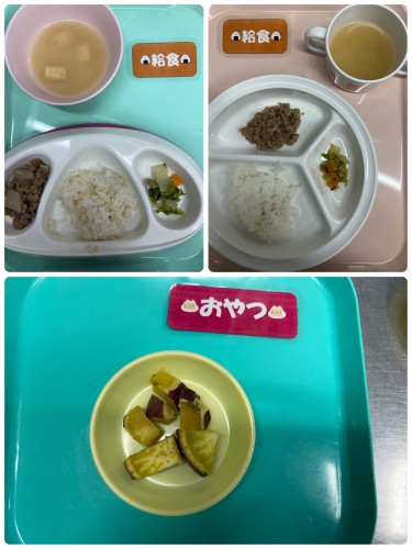 カレーライス、スープ、みかん缶 15時のおやつ きな粉麩の...
