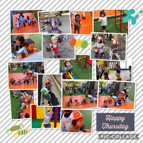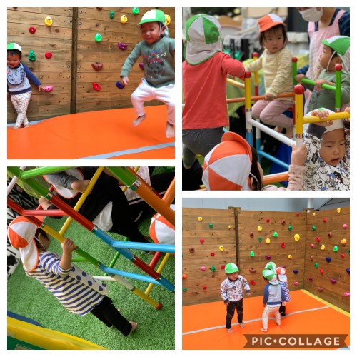 芝生でジャングルジム 2019/11/14(木) 今日は芝生のお庭でたくさん遊びました。ジャングルジムはみんな大好き!登ったりくぐったりしています。エアーマットでトランポリンのように、みんなでジャンプすると「おっとっと〜〜!」とこけてしまい、それ...